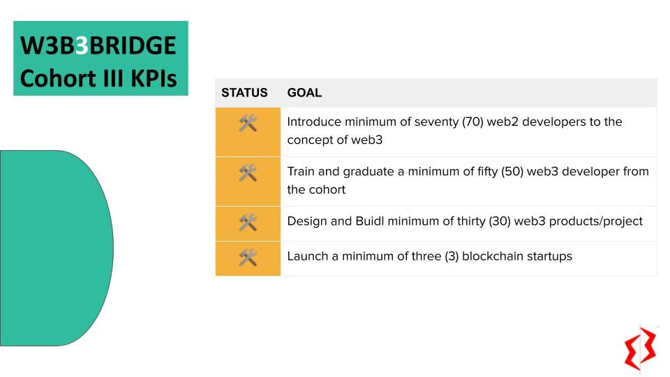 Workshop: As we are set out to give the participants of the new cohort an improved learning experience, we have been discussing with projects in the web3 ecosystem who are building layer-2 solutions, decentralized hosting services, oracles etc to host workshops during the cohort. These workshops are geared towards ensuring that participants of the cohort understand these solutions and can use them to scale their projects during the hackathons and final projects.